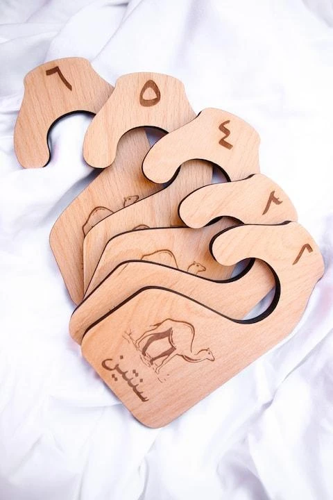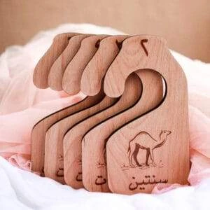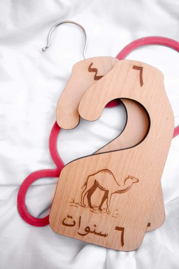 Camel themed Arabic wood closet dividers that make organizing your child’s closet cute and easy! Helps you know what they have now, and see what they need for the future.