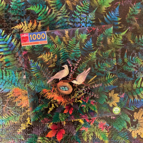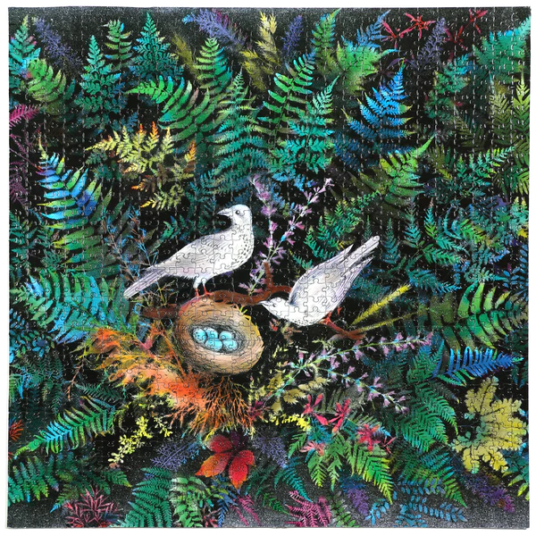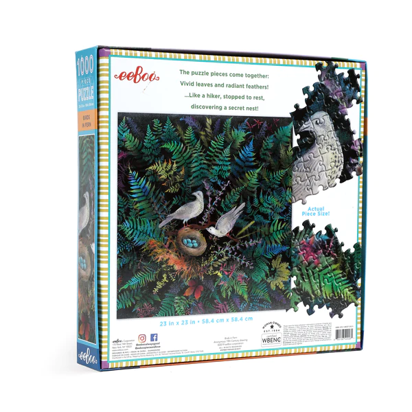 Puzzle your way through eeBoo’s Birds in Fern 1000 Piece Puzzle, inspired by a vintage drawing. Jigsaw puzzles are a great activity for the whole family to enjoy. This beautiful fern garden featuring a family of birds will transport any family of puzzlers into focused calm.