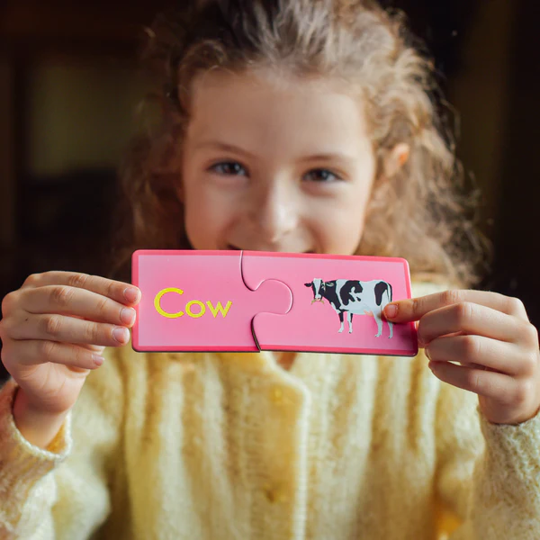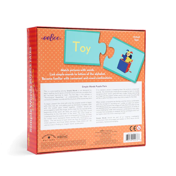 Simple Words Puzzle Pair includes 48 pieces that a child can match an image to a word, a perfect pre-reading activity. Long before children can “read” they begin to recognize individual words. When an adult reads a word, and a child selects a picture of that word to make a complete puzzle, a greater connection is made. Engaging, accessible illustrations by Saxton Freymann. Winner of Gold Oppenheim Award and Oppenheim SNAP Award (Special Needs Adaptable Product).