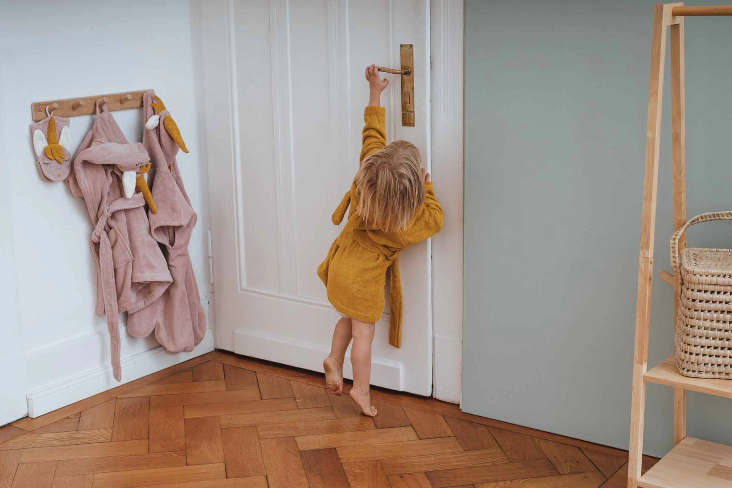 The cute bathrobe with the cute rabbit face is perfect to wrap your child safely after bathing. It is made of 100% GOTS certified organic cotton and therefore cuddly soft. The cute hood with the rabbit face keeps your child’s head nice and warm after the bath.