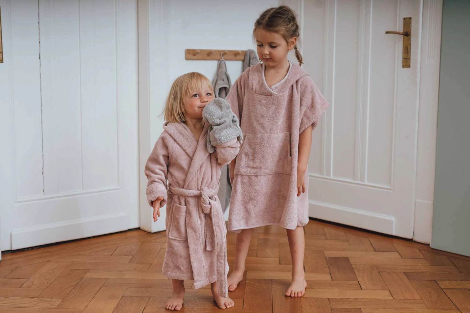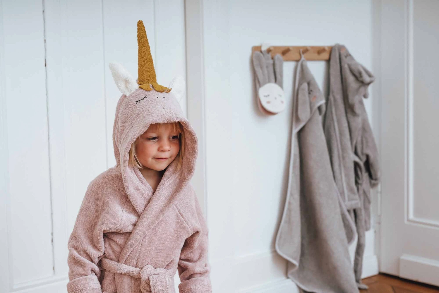 The cute bathrobe with the cute rabbit face is perfect to wrap your child safely after bathing. It is made of 100% GOTS certified organic cotton and therefore cuddly soft. The cute hood with the rabbit face keeps your child’s head nice and warm after the bath.