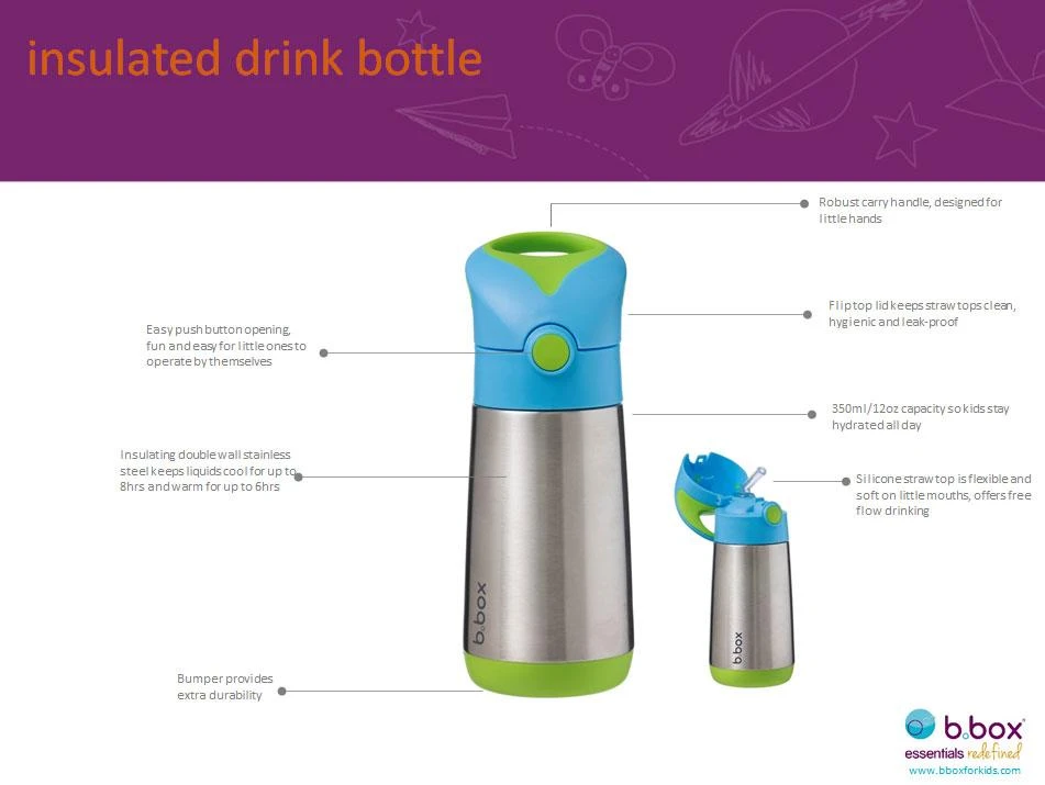 We’ve redefined cool with our new insulated drink bottle. Our newest drink bottle has insulating super powers! The double walled stainless steel keeps liquids cool for up to 8 hours and warm for up to 6, so now your little one can stay hydrated whatever the weather. Complete with carry handle and push button opening, designed specifically for little hands. Clean modern design and big kid aesthetic. Available in four fab b.box colours. Kids love our easy drinking silicone straw top.