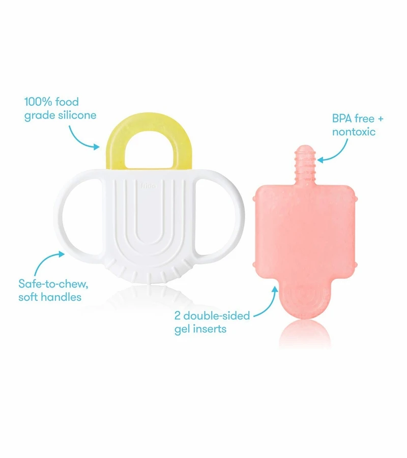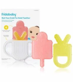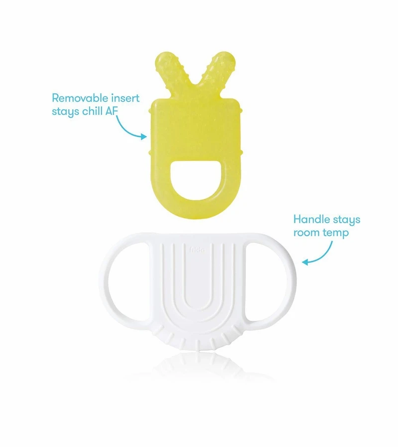 Skip the chilly teething rings and help baby soothe their sore gums without getting frostbite on their hands. The Not-Too-Cold-To-Hold Teether has a stay-warm handle for baby to hold, with two double-sided, chillable gum massagers made of BPA-free silicone. Each of the four sides is designed with shapes and textures to reach and relieve teething pain, while stimulating gums in the front + back. Sit back and chill while baby chomps away.