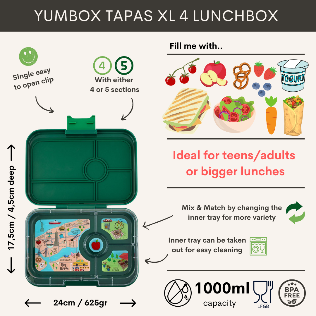 Beautiful Greenwich Green Yumbox Tapas lunch box with NYC print tray. Pack your healthy and varied snacks in your Yumbox Tapas XL lunch box with 4 compartments. The handy layout makes it easy to make your own selection of healthy portions. The possibilities are endless. Add nuts, crackers, fruit, vegetables, yogurt or even a dip. The Yumbox is leak-free due to the silicone seal between the compartments. The sections are therefore closed properly.