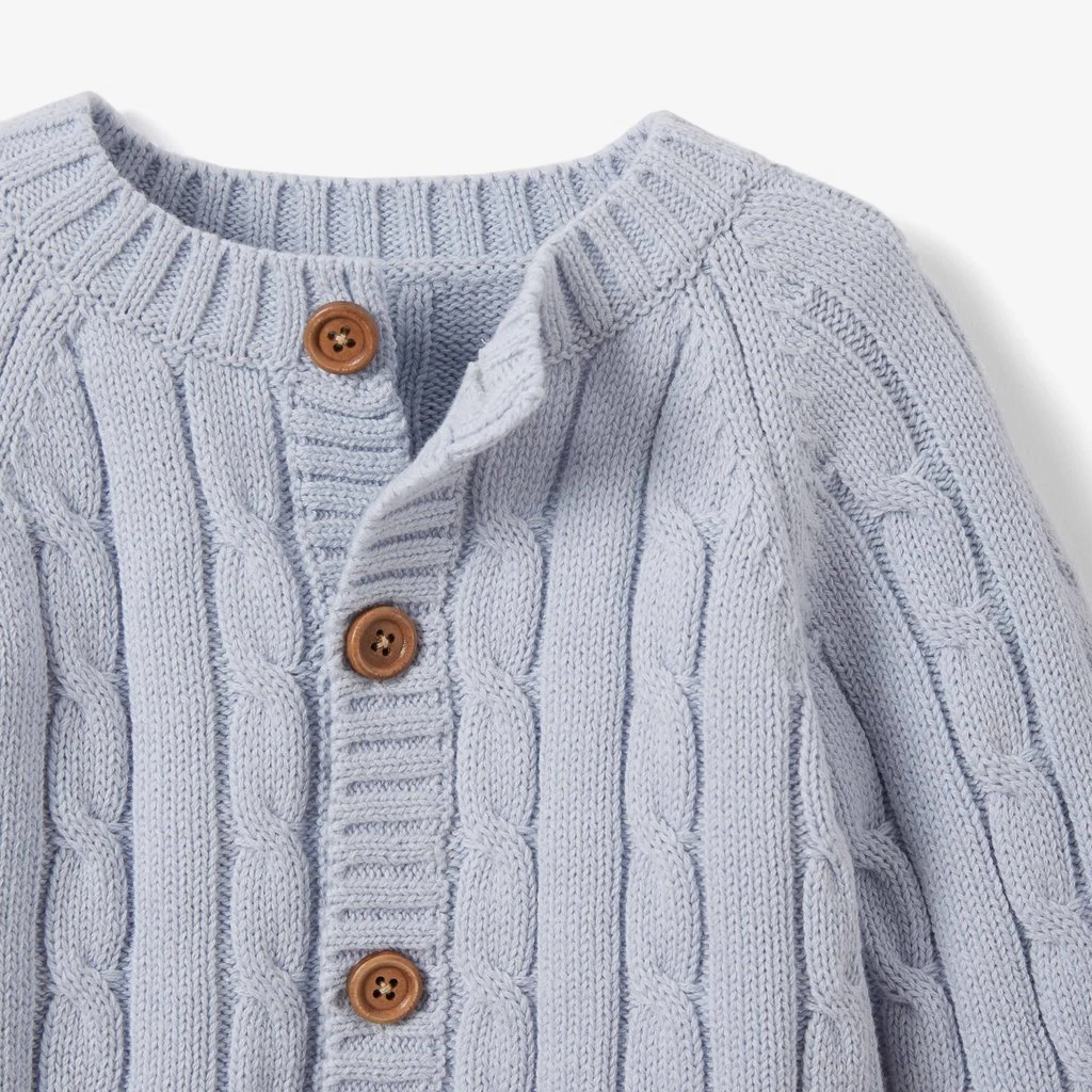 Nothing says luxury baby gift like this soft, classic cable knit baby cardigan sweater. Designed in soft colored hues, these beautiful, 100% cotton knit baby sweaters are sure to be cherished forever. Pair with a matching cotton cable knit baby hat and knit baby blanket for the perfect, luxury baby gift set. Embroidery can be easily added to make it a personalized baby gift.