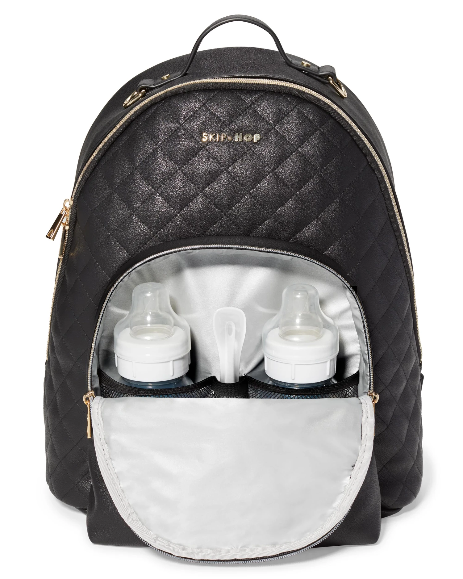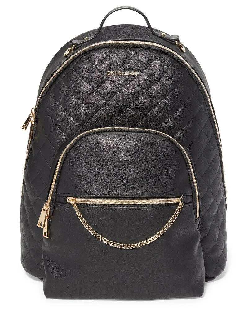 Classic and chic, Skip Hop’s LINX Diaper Backpack offers hands-free ease for on-the-go. An insulated compartment for bottles or snacks, plus lots of pockets keep you organized. Luxe vegan leather, quilting detail and a golden chain accent add extra polish.