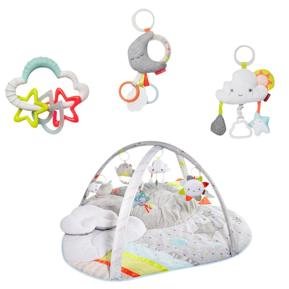 Every cloud has a silver lining—and this dreamy baby activity gym is no exception! Offering hours of plush playtime, it features a soft color palette to complement modern décor along with pops of neon to stimulate baby’s sight. Five celestial-themed hanging toys will engage baby with lights, music and other stimuli while the cushy mat offers ultimate, cloud-like comfort. When it comes to baby’s enjoyment, the sky’s the limit!