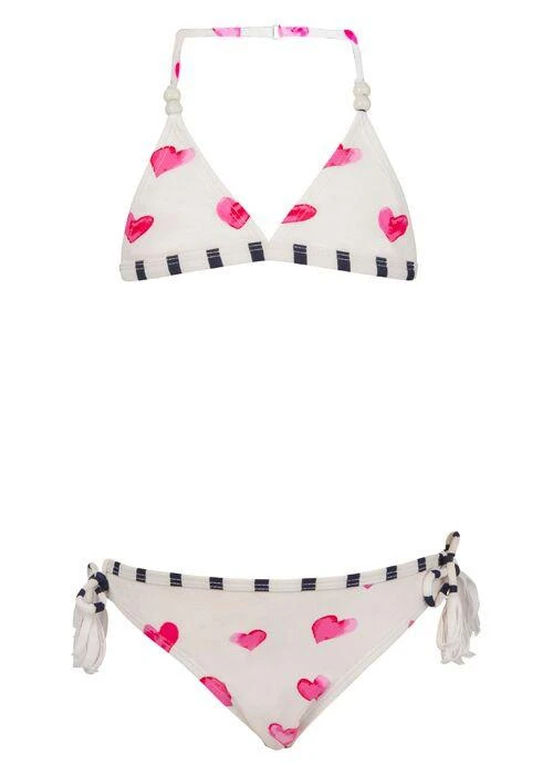 The sweetest bikini this summer. Pink watercolor hearts feature on a solid white background with nautical navy and white stripe trim. Bikini top features fixed back clasp and adjustable neck strap. White beads on the neck line finish off this sweet top. Bikini bottom features tie sides with on trend tassles. The perfect bikini for a day at the beach or pool.